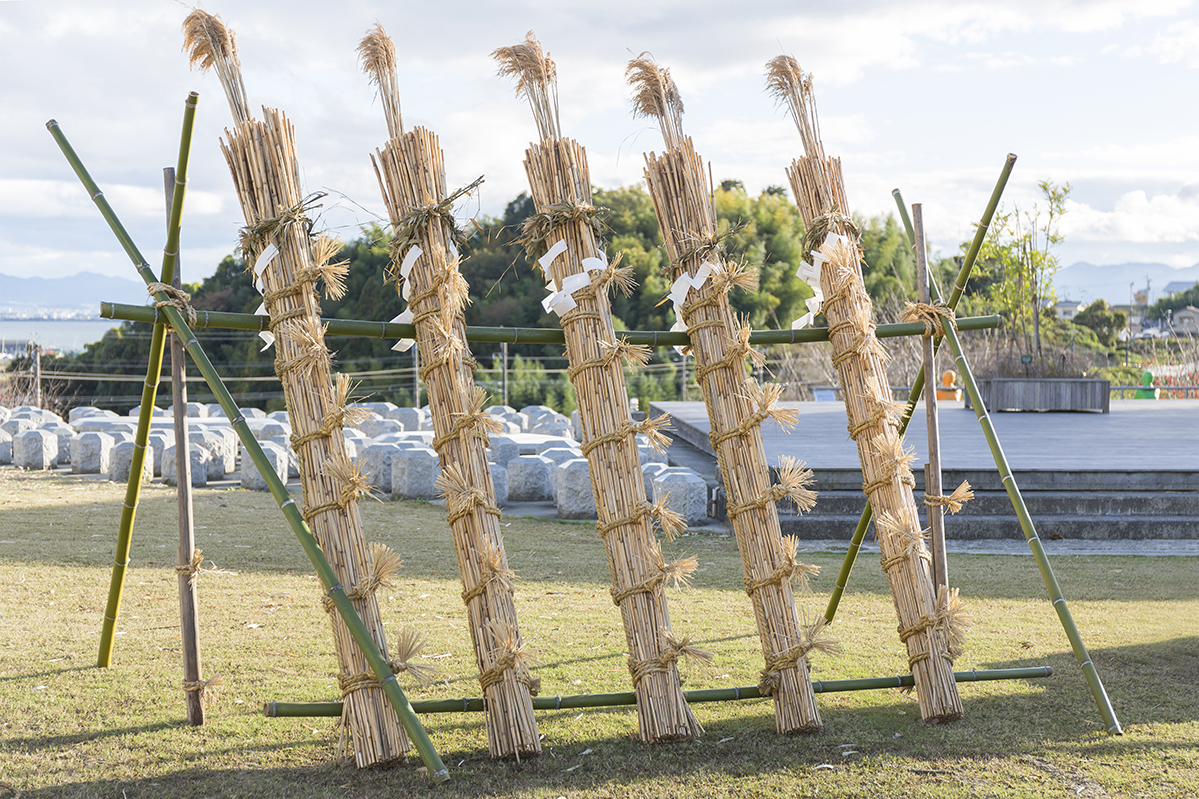 今回、展覧会のシンボルとして、ガーデンギャラリーに巨大なヨシ松明をつくります。ヨシ葺き屋根やヨシ簀として庶民の生活に不可欠であったヨシは、水の浄化や魚たちの揺りかごとしても大切な琵琶湖の資源の一つです。また、琵琶湖に抱かれる豊かな資源の中に、淡水真珠があります。ピンク・ローズ・パールとフランスで紹介されたこの真珠は、歪んだかたちと変化に富む美しい色合いが魅力です。