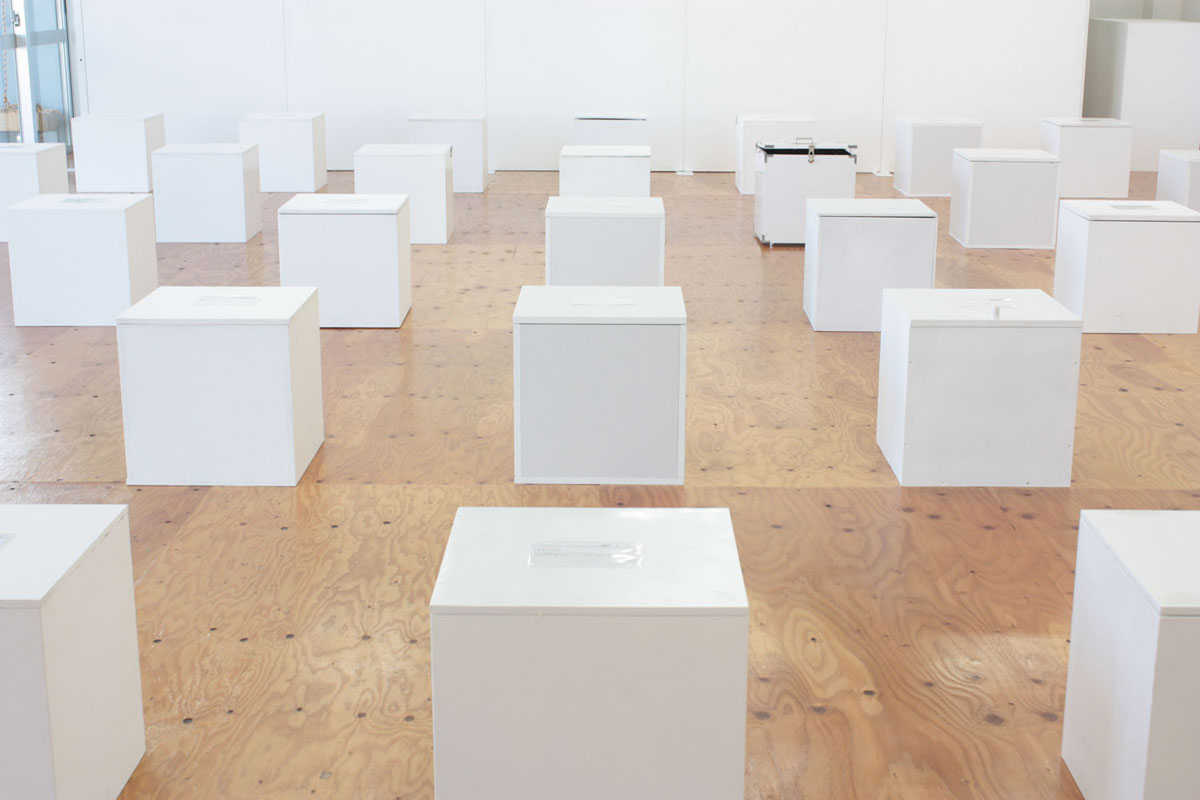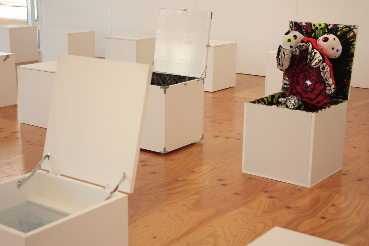 「BOX美術館展」は、京都・岡崎にあるGALLERYはねうさぎが、子供たちに現代美術と触れ合う機会をもうけることを目的に、1998年より始めました。毎年、テーマにもとづき参加作家が40cm角の箱の中に表現します。本学ギャラリー巡回にあたり、本学学生も参加します。