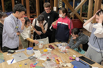 2004年10月に完成したカフェテリア「結」の建築は、間伐材や稲藁、土、瓦などの滋賀県下の循環型素材を多用し、地元の職人さんや教員の指導のもと、学年を越えて集まった住環境デザインクラスの学生有志が中心となって自力で建設したものです。建築・インテリアはもちろん、椅子・テーブルから照明まで、調査・研究・デザイン・制作・建設と、会議を重ね、夏休み返上でつくりました。