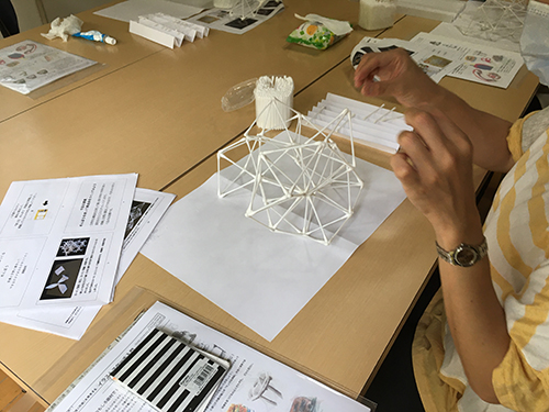 「めんぼうによる立体」は、トラス構造をヒントに、最小限の部材で効率のよい構造物をつくるというものです。トラス構造という”ルール”によって造形するため、手を動かしていくと、どんどん大きな構造体になります。「大きくなるほと見え方も広がり、面白い」「勝手に形ができていく感じ」と、ほとんど立体造形をされていない方でも手軽に立体造形の面白さを実感していただけたと思います。