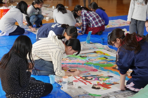 ワークショップ当日は卒園生23名が集まってくださり春の陽気の中、思い思いの色彩を重ねていきました
