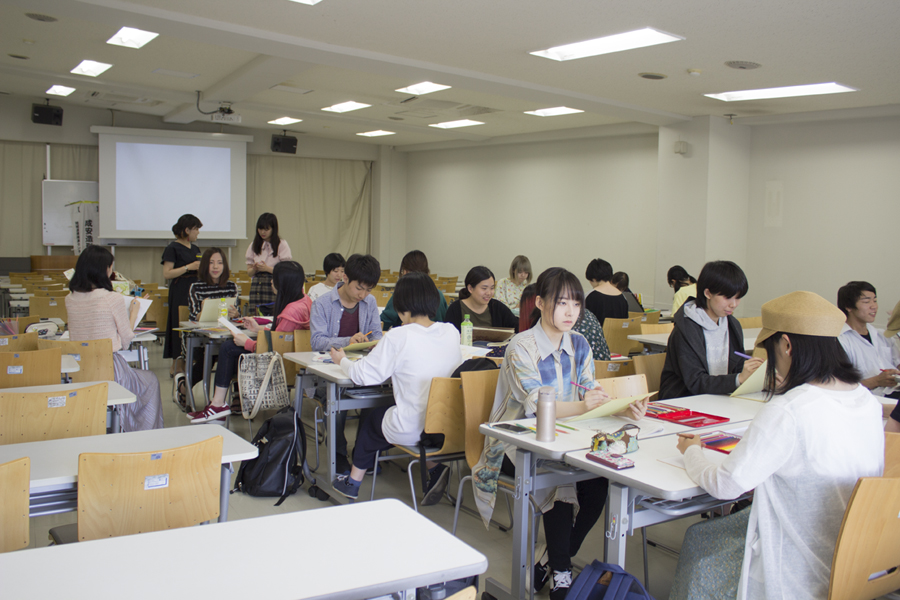 黙々と制作する学生たちに講師の三谷さんや古川さんから、会話のコツなど相手とのコミュニケーションの取り方についてもアドバイスがありました。